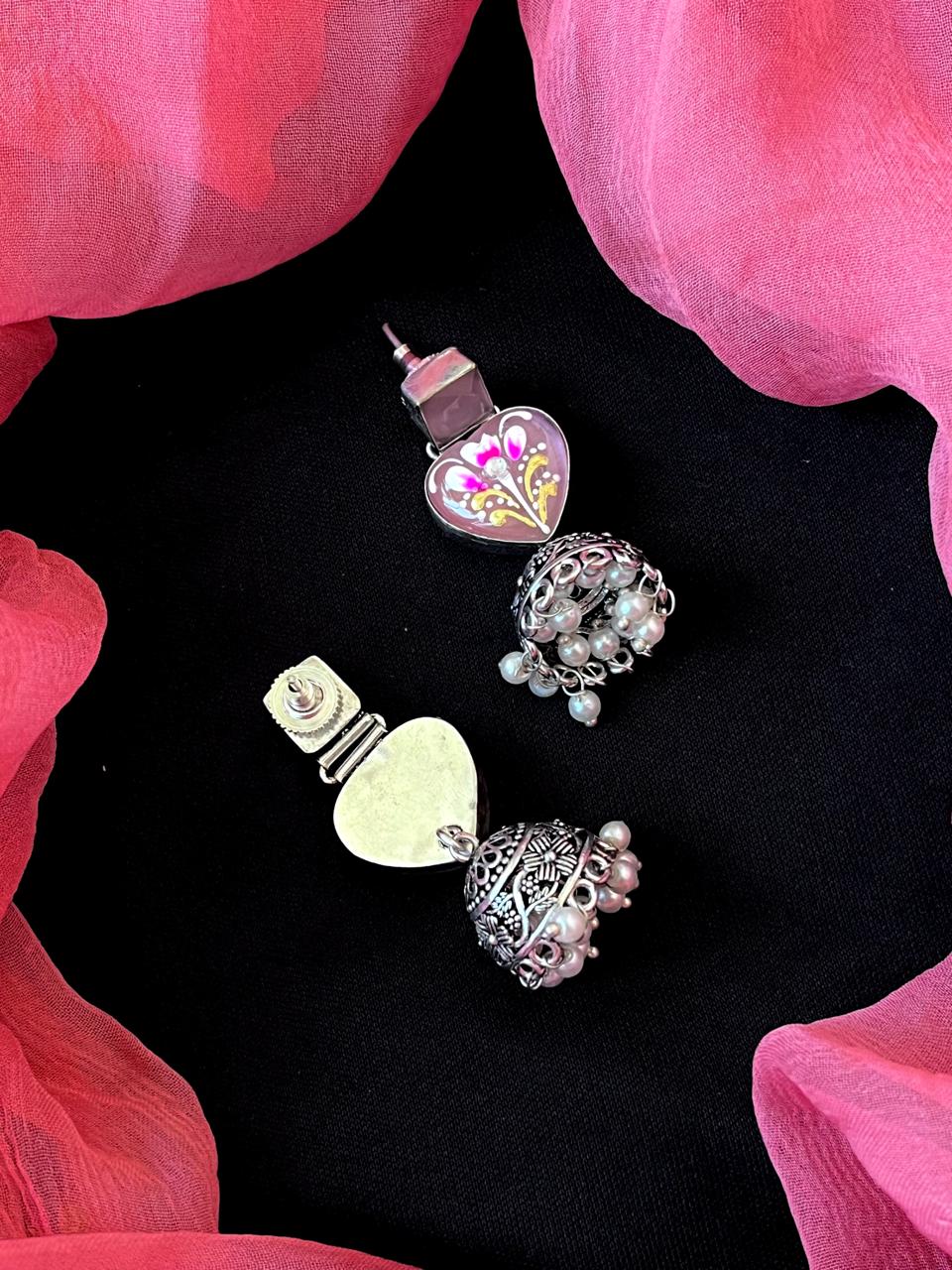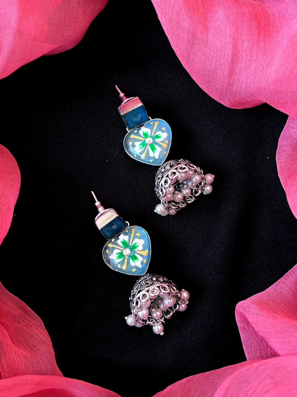 Hand Painted Monalisa Stone Top with Silver Replica Jhumki Earring