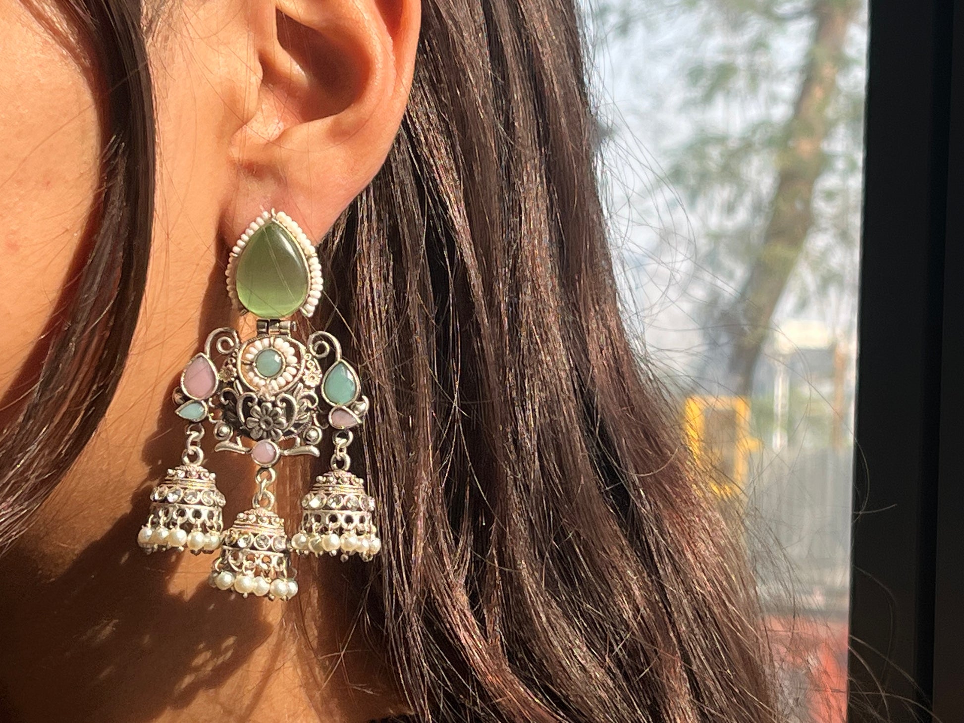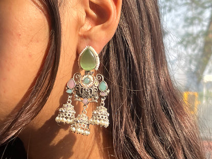 Monalisa Stone Silver Replica Three Jhumki Earring