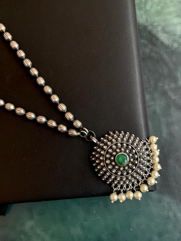 Elevate your ethnic elegance with this beautifully crafted Oxidized Silver Replica Pendant Chain Necklace, designed to blend traditional charm with everyday wearability. Featuring a detailed oxidized silver–tone finish, the necklace showcases an intricately carved pendant that adds a bold and artistic touch to any outfit. The lightweight chain sits comfortably on the neckline, making it perfect for festive occasions, casual outings, or pairing with Indo-western styles.